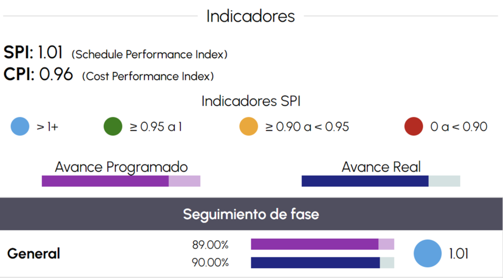 PMOX genera de manera automatica los indicadores de tiempo y costo con base en el progreso del proyecto.